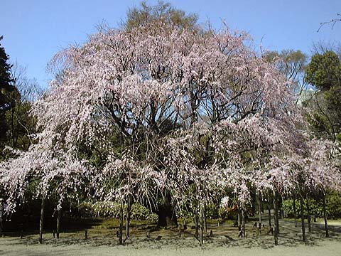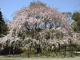 内庭大門を入って少し歩くと、見事なシダレザクラに出会える。樹高18m、枝周りは20mもあるという大木だ。