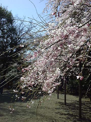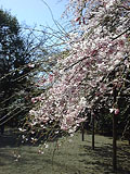 シダレザクラは薄いピンク色の一重の花を付けている。去年ここを訪ねたときは曇空で花の色が冴えなかったが、今日は明るい太陽の下、花の彩りが強調されているように見える。
