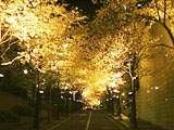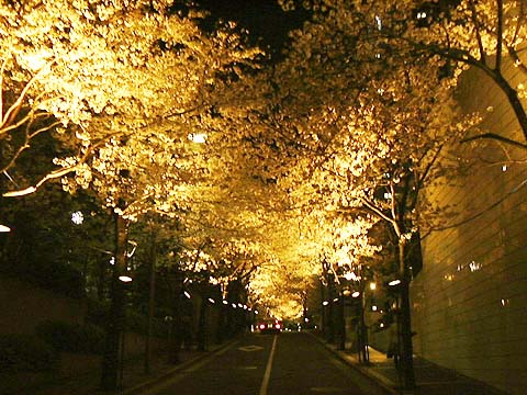 アークヒルズをほぼ取り囲むように、全長約700mの桜並木がある。桜はライトアップされていて、夜の街に、刹那の光の帯を形作っている。