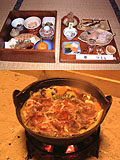 上が箱膳、下が天然のいのししを使ったいのしし鍋。 |