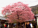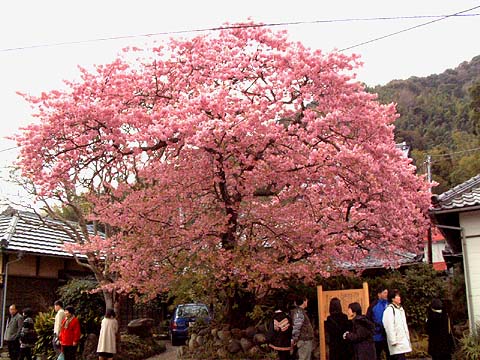 | 3. カワヅザクラの原木。ここも3年前に比べてずいぶん人が増えた。 この方向から見ると、原木は見事な楕円形をしている。 2001.3.3--静岡県河津町(60K) |
