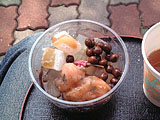 おやつのさくらあんみつ。盛り付けが悪いのは私が自分でやったせいなので念のため。真ん中に桜の花の塩漬けが乗っている。 |