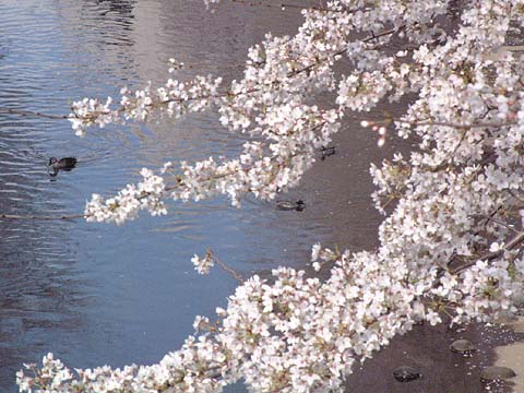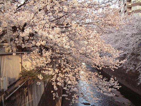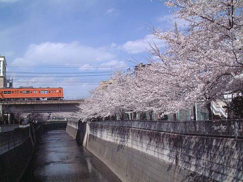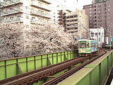桜が再び姿を見せるのは都電が神田川を渡る高戸橋付近からだ。先ほどにもまして桜が濃厚に咲いている。桜の樹齢が古いのか、あるいはどっしりと根を下ろしているせいか、川に向かって盛大に枝を伸ばしているものが多い。桜の根の高さよりはるかに低い位置で花が咲いている。自由な空間があったので、日光をせいいっぱい浴びるために枝を広げたのだろう。