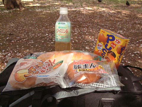 花見にはちょっと似合わない、パンの昼食。(↑45KB)