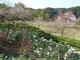 手前に小さなバラ園があり、桜とバラの競演を楽しむこともできる。