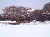 雪景色の中で咲く二季咲桜。背景にあるのは好文亭。