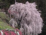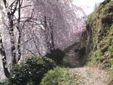 枝垂桜の本数は20本ほどだが、そのうち道路のすぐそばに植えてある枝張りのいい3,4本が斜面に風雅な景観を作り出す。枝垂桜撮影の大敵である風がほとんどなくてラッキーだ。