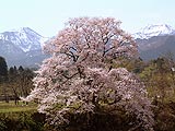 向野の桜は樹齢300年以上と言われるエドヒガン。雪の残る山を前にりりしく立つ。川に向いた側の根の部分は土がなくむき出しになっている。ライトアップもするらしく照明がいくつか設置されているが、風景を少し台無しにしてしまっている。人の目に見えないところに置いたらいいと思う。
