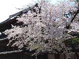 すぐ隣には京都円山公園からもらったという若い枝垂桜が薄紅色の花を咲かせており、こちらは満開。