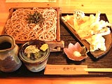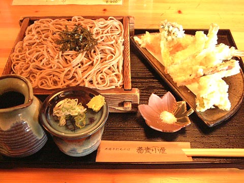 - 昼:途中で見つけた蕎麦小屋という店で、冷やし海老天そばを食べる。そばは、オリジナル、更科、挽ぐるみ(皮ごと挽いたもの)の3種類から選ぶことができ、私は挽ぐるみをいただく。残念なことに、風邪のせいで味が少しわからなくなってきた。