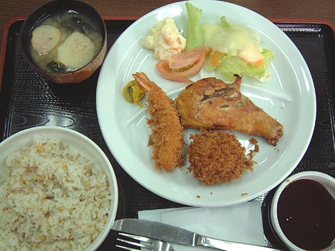 - 昼:新しいメニューがいつも増えているレストラン純平で、五穀ごはんのヘルシー弁当をいただく。五穀ごはんの他、なすのからし漬、エビフライ、鶏肉のグリル、カレーコロッケ、ポテトサラダ、レタス、トマト、味噌汁。五穀ごはんはおいしくて、おかずもボリュームがあり大満足。特にエビフライが食べたことがないくらいぷりぷりだ。パン粉も自家製だという。