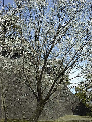 この桜はすでに満開で、少し散り始めていた。 花の大きさはやや小ぶりで、すでに葉も出ていたことから ソメイヨシノではなく、山桜系統だと思う。 1998.3.23--熊本城址 ↑ click photo(91K) |