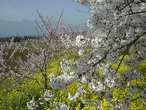 道ぞいで見つけた風景。桜、桃、菜の花と、春の花の競演だ。背景に見えるのは甲斐駒ヶ岳。 1998.4.16--山梨県高根町 ↑ click photo(99K) |