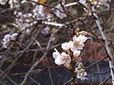 桜の種類は不明。花は一重5弁。花の印象は、大きさといいやや奥目がちに咲くところといい四季桜に似ている。ただ、四季桜はガクが少しくびれたひょうたん型であるが、この桜はかなりくびれているのが違う。自信を持って四季桜とは言いにくい。