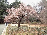 もう1本は日本庭園の翔天(しょうてん)亭の近く。ここは広々とした芝生に面していて風に当たりやすいせいか、まだ咲き始めたばかりだ。若い女性5人が、寒さなんかものともせずに近くの芝生でにぎやかに遊んでいた。