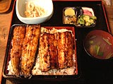 - 昼:ほぼ毎年立ち寄っているうなぎの大川屋に入る。おかみさんは私の顔を覚えていてくださった。うな重の特は、お重のごはんの中にもうなぎが埋もれている。この店ではうなぎを蒸さず、生のまま炭火にかける。そのため皮がぱりぱりで、身もしっかりしているのが特徴だ。