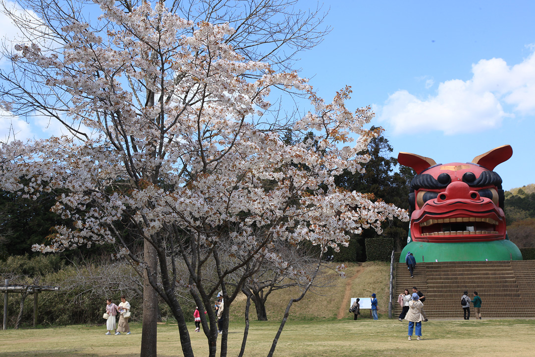 巨大な獅子頭の手前に見頃のヤマザクラがあった。獅子頭は展望台になっていて中に入ることができる。数日後には、獅子頭と八重桜とのコラボレーションも見られるはず。