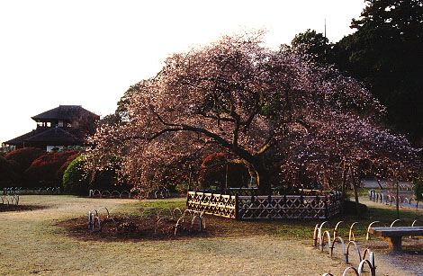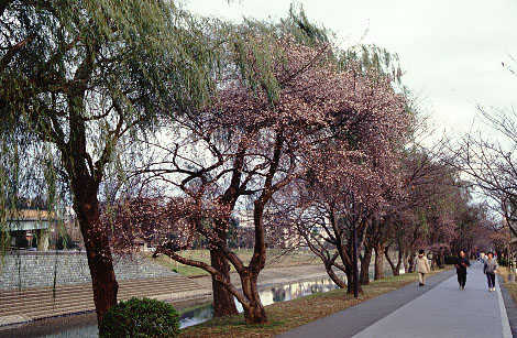 千波湖と桜川に挟まれた堤防上に植えられている二季咲桜。