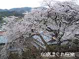 る1本の枝垂桜。先代の跡に植えられた、樹齢約70年の形の良い木。夜のかがり火やライトアップの中で見ると更に趣がある。この他に約850本の桜が植え