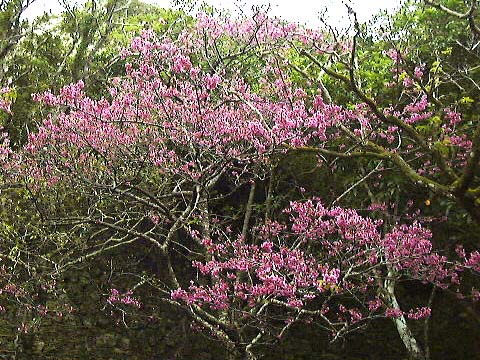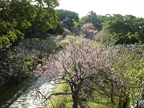 最後に訪れたのは中城(なかぐすく)城跡。中城城は15世紀中頃に拡張された、沖縄随一の名城と言われる城だ。石を積み上げて作った城郭が見事だ。城内には2,30本しか桜がないようだったが、中にはとても濃いピンク色の花を付けた木があり、城郭を背にりりしく立っていた。