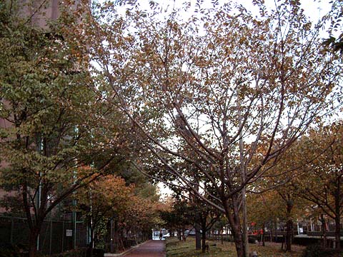 遊歩道にはいろいろな種類の桜が植えられている。春咲きの桜はすっかり黄葉していて、オレンジ色のトンネルを作っている。冬咲きの桜はそれに混じって咲いている。