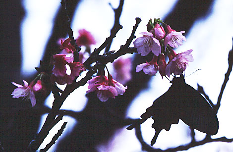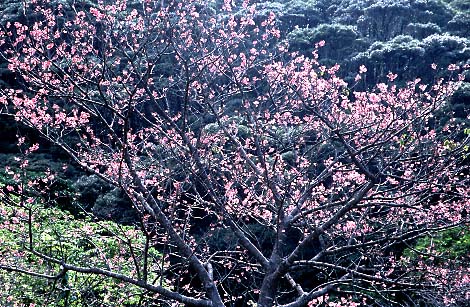 1日目は1月22日。桜の名所八重岳に着いたのは正午少し前。先週町役場に電話で伺ったところによれば20日頃が見頃ではないかということだったし、満開の木の下で成人式を行なったとも聞いていたから、今日では遅すぎるのではないかとも心配していた。しかし、山の頂上に向かう道沿いの桜並木の開花はまちまちだった。満開の木もあれば、全く咲いていない木もある。