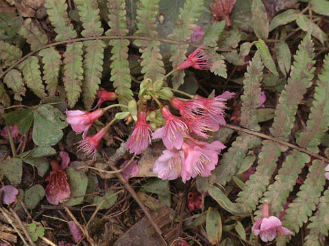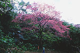 朝食もそこそこに宿を出て、昨日お会いしたSさん、Yさんと大宜味村の国道58号線横で待ち合わせる。ちょっと道に迷いながら山道に入る。車が進めなくなったところから徒歩。立て札もない中、見物帰りの方から道を教わりながらぬかるみ道を15分も歩くと、地面にピンク色の花びらがびっしりと落ちている。