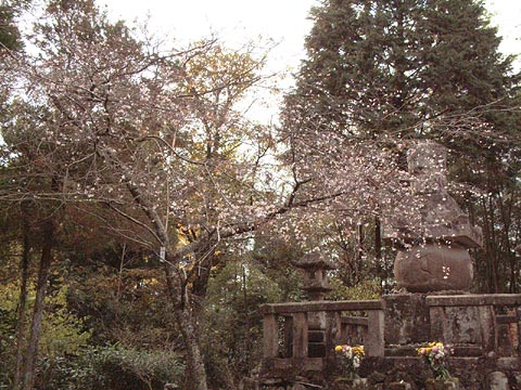 謎は残るが桜は見事だ。本堂前の桜はのびのびと枝を広げている。春の染井吉野にたとえると3,4分咲きといった感じだ。本堂前の撮影を終え、お寺の方が是非訪ねて欲しいとおっしゃった、奥まったところにある堀尾城主の墓所まで歩いた。こちらの桜も、かなり良く咲いている。きっと堀尾城主の霊を慰めるために後世の人がここに植えたのだろう。