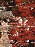 紅葉の前で咲く桜。