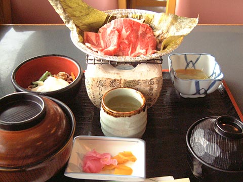 - 昼:中央自動車道恵那峡サービスエリアのレストランで、4年前にも食べた牛肉入り朴葉味噌定食をいただく。朴葉味噌の香ばしさに加えて、飛騨牛まで味わえる贅沢な食事だ。前回同様、真昼間からのんびり朴葉味噌を焼いていたのは私一人だ。