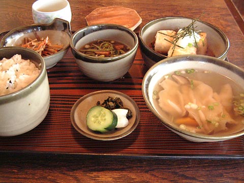 - 昼:人吉城址の撮影を終えた午後2時半ごろ、城址の駐車場に隣接する城内茶屋で、三の丸お膳を食べる。わかめごはん、澄まし仕立てのだご汁(だんご汁)、きんぴらごぼう、なめこそば、揚げだし豆腐、漬物。だご汁はすいとんのようなもので、懐かしい味がした。