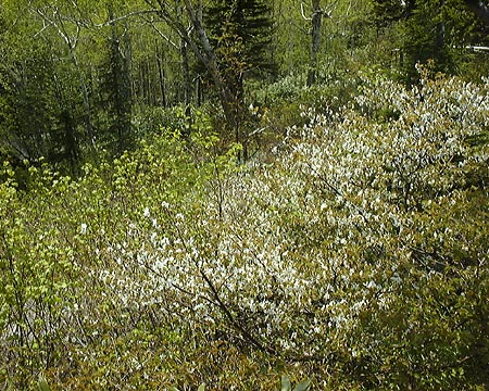 2.神の林の花 黒岳が属する大雪を、アイヌ語でカムイミンタラ(神々の庭)という。 この桜はさしずめ、神の林の花と言えるかも知れない。 2003.6.6--北海道上川町黒岳5合目高松台(83K) |