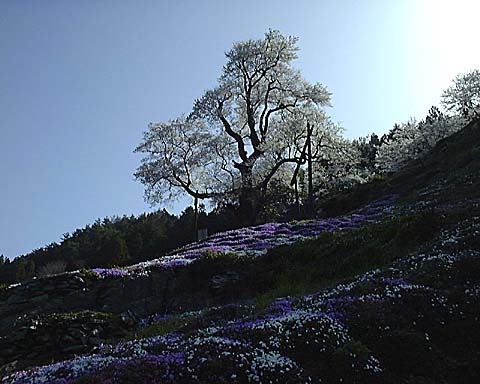 ひょうたん桜は傾斜地に立っている。桜の下方には芝桜が植えられている。