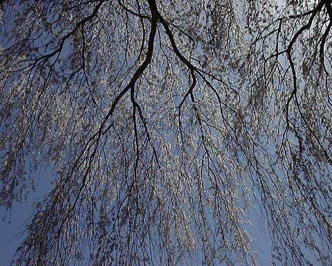 しだれ桜を真下から見上げたところ。桜の淡いピンク色が空に透けて美しい。