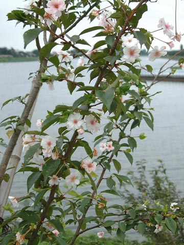 ここには2001年12月に51本の十月桜が植えられたという。いつもの年なら10月終わりから咲くらしい。今日は10本ほどの花ががちらちらと咲いている。そのうち城沼に近いところにある1本はかなり花を付けている。とは言っても、春の染井吉野にしたら3分咲きぐらいだ。おそらくこれで精一杯の開花だろう。
