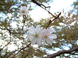 十月桜は八重咲き、冬桜は一重咲きなので、すぐに見分けがつく。桜園地のほとんどを占める春咲きの桜は、葉がそろそろ枯れ色に変わってきて、少し葉を落とし始めている。でも、十月桜はほぼ葉を落としていて、代わりに白い花を咲かせているのでかなり目立つ。とは言え、春の桜ほど盛大には咲かないので、あまり写真映えはしないのが残念だ。冬桜のほうはまだ幼木なので、見上げなくても十分花が近くに見える。