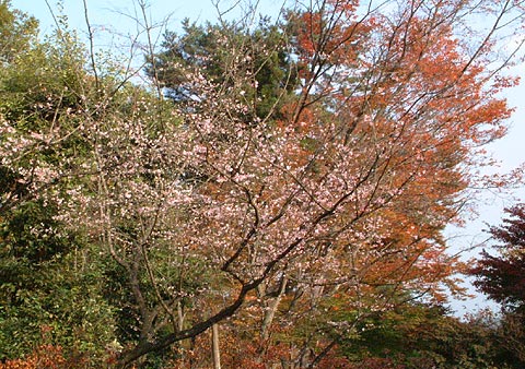 2. 紅葉を背景に咲く十月桜。 2003.11.8--埼玉県神泉村 城峯公園(76K) |