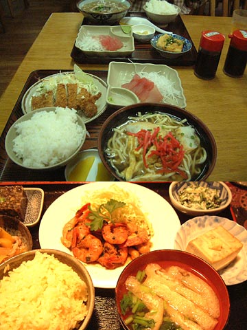 向こう側は友人の中身汁定食。 下は宿で食べたヘルシーな夕食。 (↑49KB) |