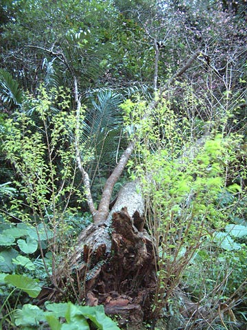 2. 切り取られてしまった百年木。 下中央の黒っぽい部分は切り株。 その周りから何本もの彦ばえが出ている。 右後ろには、台風で倒れた幹の1本に わずかに花がついている。 2004.1.24--沖縄県大宜味村(79K) |