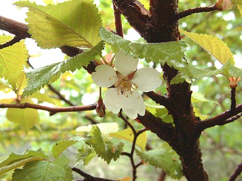 | 1. 葉陰で辛うじて花を残すチシマザクラ。 花の左にはつぼみも見える。 2004.7.18-北海道羅臼町羅臼湖(45K) |