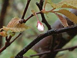 2. チシマザクラのつぼみ。 まわりにある葉の微毛には霧が付着して 細かい水玉ができている。 葉に毛があるのはチシマザクラの特徴だ。 2004.7.18-北海道羅臼町羅臼湖(33K) |