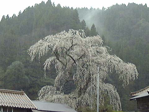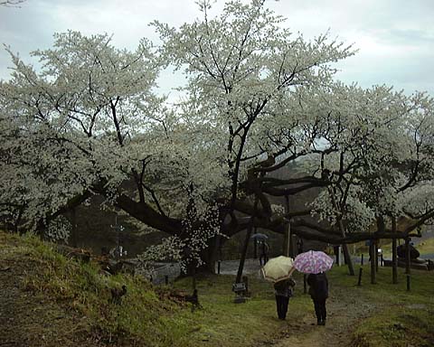 大平桜。あいにくの雨で、しかも平日だというのに、ひっきりなしに見学者が訪れる。 1998.4.1--島根県三隅町 ↑ click photo(57K) |