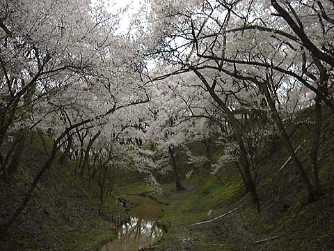 空堀の内側に向かって桜がたたみかけるように咲いている。