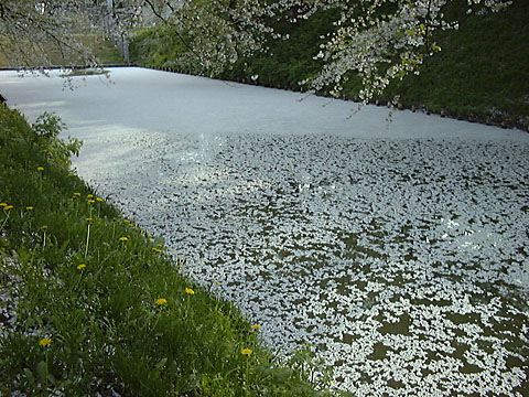 弘前城址のお堀。すでにソメイヨシノが散り始めていて、お堀の水面を花びらが埋めていた。 1998.4.22--青森県弘前市弘前城址 ↑ click photo(89K) |