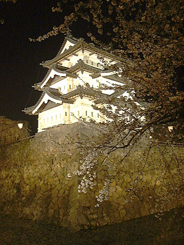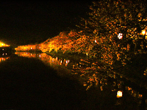 西堀。ライトアップされた桜並木がお堀の水面に映る。 1998.4.22--青森県弘前市弘前城址 ↑ click photo(68K) |