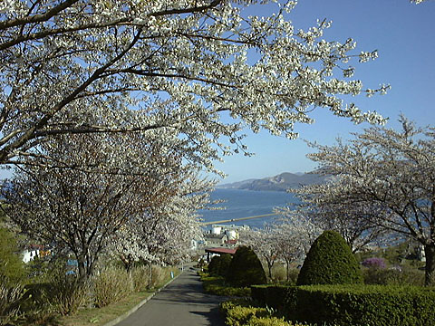 海の方向へ下る桜並木。様々な種類の桜が植えられていて、微妙な花の色の違いを楽しむことができる。 1998.4.30--北海道小樽市手宮公園 ↑ click photo(100K) |