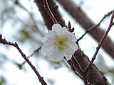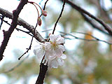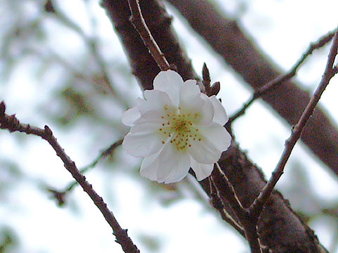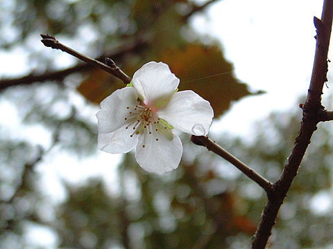 2本ある冬桜はたった1輪だけ開花していた。一重5弁でふっくらと咲く、私の好きな花だ。花びらの上には、今朝まで降っていた雨粒を1つだけ乗せていた。
