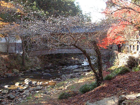 | 1. 川と橋と紅葉を背景に咲く桜。 橋の名前は巨蟒橋(きょもうきょう)。 開山した大通禅師がこの地を訪れた時、 大蛇が自ら橋となり迎え入れたという故事にちなむ。 2004.11.22-広島県三原市 佛通寺(74K) |