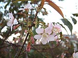 一旦出口を出て、5分ほど歩いて桜のもとへ。畑の中には何本か桜があるが、咲いているのはこの木だけだ。花は一重5弁。秋に咲く種類ではない。おそらく返り咲き(狂い咲き)であろう。染井吉野のようにも見えるが、ガクがやや太めなのと花びらどうしの隙間がやや大きいのでこちらも確かには言えない。