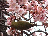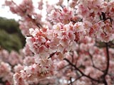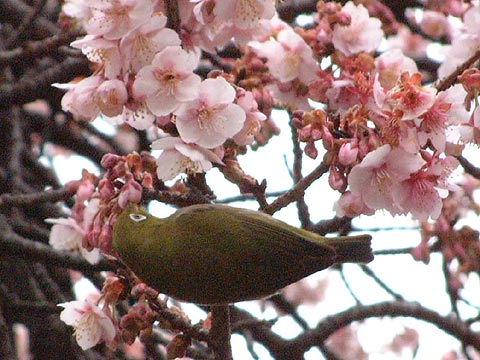 次は新宿御苑。御苑で寒桜を見るのは初めてだ。ここには2本の寒桜がある。1本は管理事務所の近くにある小さいもの。こちらはすでに6,7分咲きまで進んでいる。時々メジロがやってきてはあわただしく花を移動しながら蜜を吸う。木が小さいので、意外と間近でメジロを見ることができる。